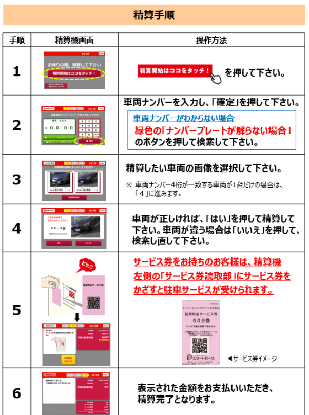 駐車場での精算方法をご案内します。 お電話でのご案内、施設・店舗スタッフによるご案内は行っておりません。ご了承ください。